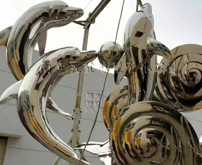 在不銹鋼雕塑制作中主要通過亞光和鏡面兩種肌理效果體現不銹鋼的材質美。通常情況下,大面積表面多用亞光效果,而局部重點或管材部分用鏡面效果;主體用亞光效果,球體用鏡面效果對比好,這也是城市雕塑常應用的一種處理手法。